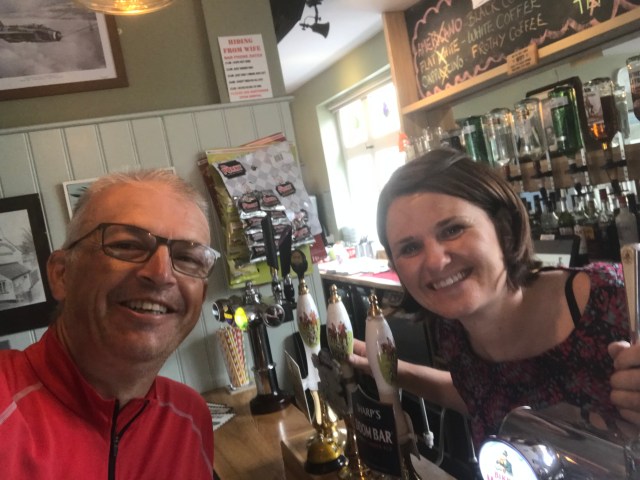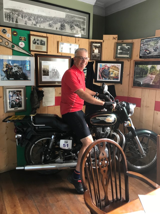 I order a pint of skull and spanner’s, their own beer and start chatting. It is strange as It was as if I knew Sal and the pub as I had been listening to ‘we need to weaken the mixture ‘ on the way there. Guy explains how he bought the pub, does it up with Sal and gets Sal to run it. They have done an incredible job. I share what I am doing and have a lovely conversation about it. Im thinking it’s taken me 9 days of riding to get there 700 miles, your brother would do it in 3. Then console myself with the beer, knowing my bike is 45-50kg and Guy and his bike and kit weighed in at 25kgs when he rode the tour divide. An extreme long distance mountain bike race from Banf to the Mexican border. I’m highly honoured when I’m asked if I’d like my picture taken on the bike, would I? You bet! I can only stop for the one and say my farewell. In case you are wondering I can recommend the beer!